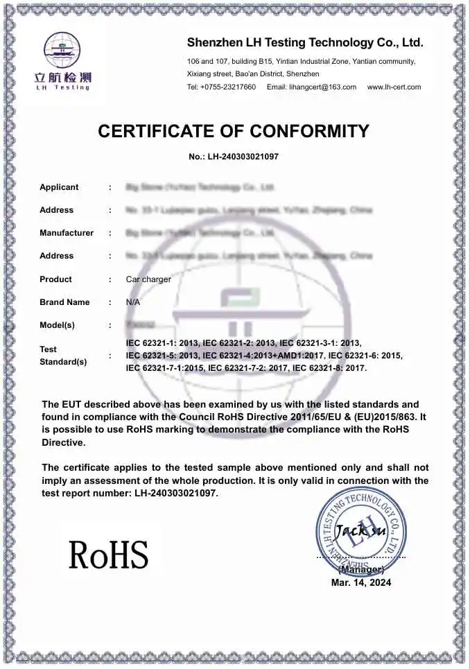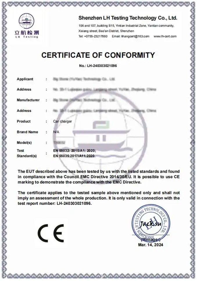 A: Minangka pabrik profesional, produk kita tundhuk karo standar safety lan lingkungan internasional. Kita nyedhiyakake produk sing disertifikasi CE lan RoHS. Salajengipun, fasilitas produksi kita disertifikasi BSCI lan ISO, mesthekake yen Adaptor Pangisi Daya Mobil kita cocog karo standar teknis lan etika sing ketat sing dibutuhake dening merek global premium.