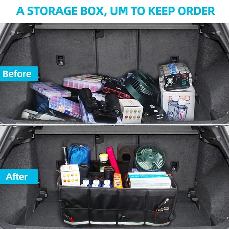 Telung kompartemen utama ngatur alat, panganan, peralatan olahraga, pembersih, lan barang darurat. Papat sisih kanthong papat bolong nyekel barang-barang cilik kaya andhuk utawa kertu. Kanthong ing sisih ngarep directice dadi rintangan lan pungkasan. Iki cocog karo truk, sedan, SUV, Van, lan cukup akeh kendharaan.