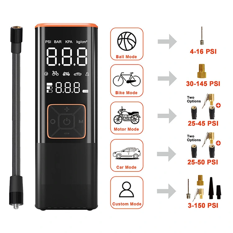 Unit tekanan: PSI, kPa, bar, kg / cm², lan mode mode inflasi preset. Sampeyan bisa ngeset tekanan saka papat prasetel mode miturut kendharaan sampeyan. Pompa udhara iki cocog kanggo: