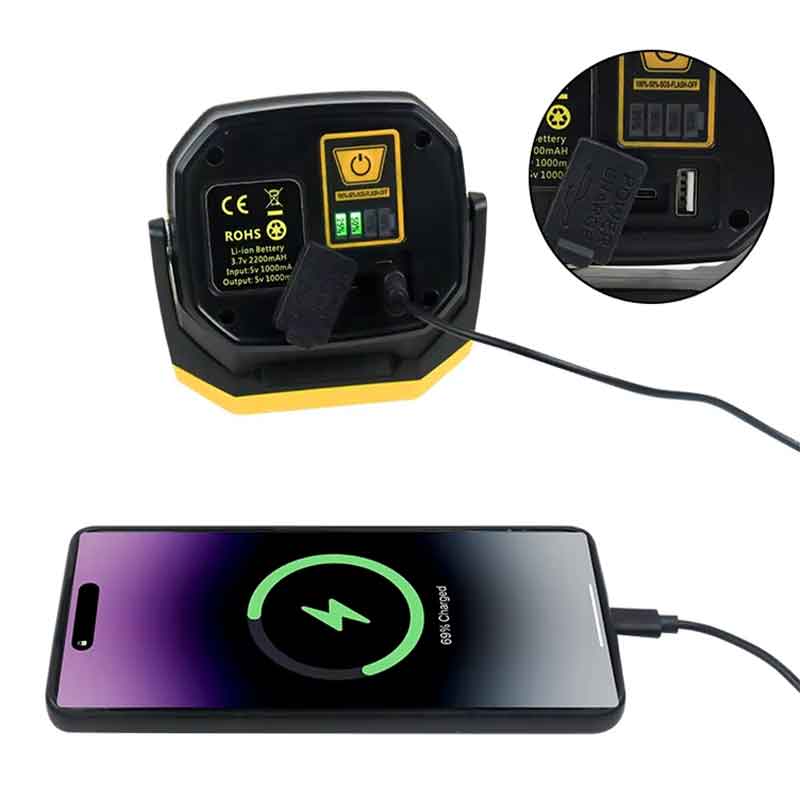 A: Nggih. Port USB-C ndhukung input (ngisi daya lampu kerja) lan output (tumindak minangka bank daya kanggo ngisi daya piranti seluler).